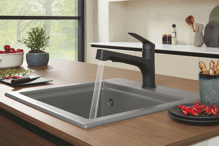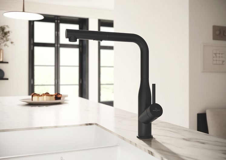 Arbeitsplatten und Möbelfronten in Schwarz sehen fantastisch aus, beeinflussen jedoch den Charakter der Raumatmosphäre stark. Für einen leichteren Schwarz-Look sind daher zurückhaltende Akzente ideal, etwa am Spülplatz. Bereits seit 2022 bietet Villeroy & Boch hochwertige Designarmaturen im samtigen, tiefschwarzen Matt Black an, die als extravagante Begleitung einer Keramikspüle für Aufsehen sorgen. Dabei macht die Kombination den Style aus: Eine schwarze Armatur präsentiert sich klassisch mit strahlend weißer Keramik, puristisch mit feinen Grautönen wie Steam oder Stone und natürlich mit dem sanft-erdigen Beige Almond.