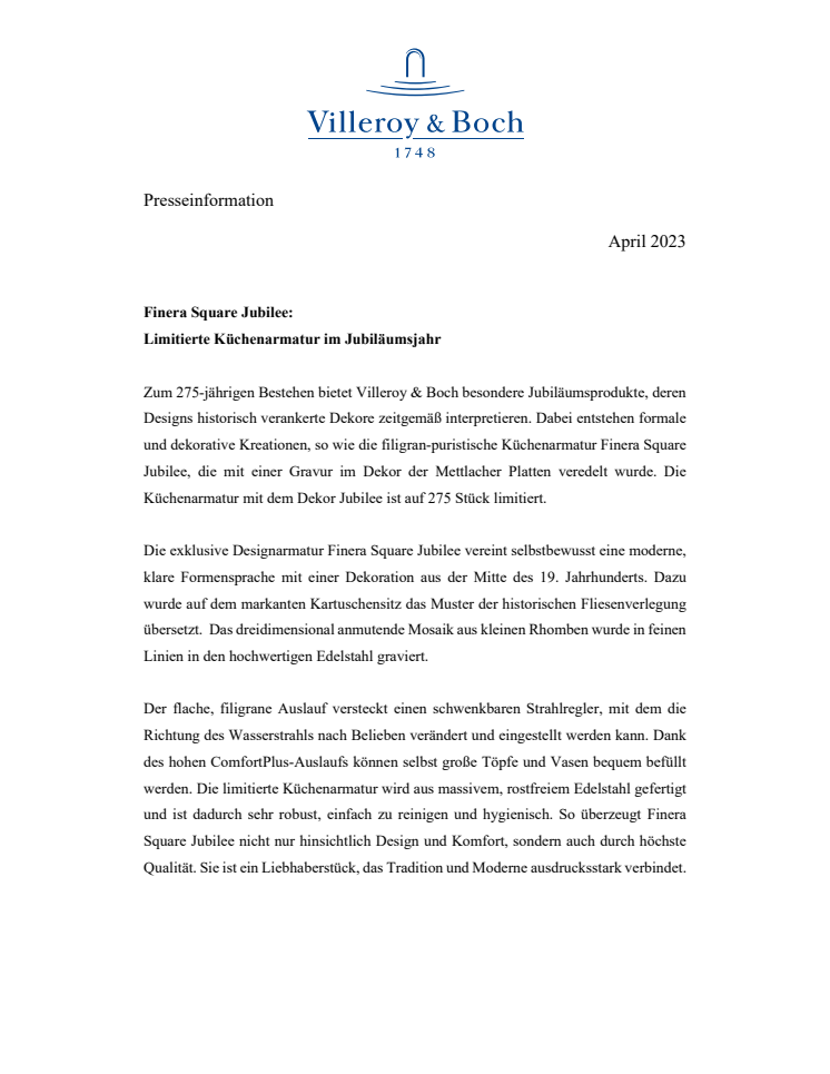 Zum 275-jährigen Bestehen bietet Villeroy & Boch besondere Jubiläumsprodukte, deren Designs historisch verankerte Dekore zeitgemäß interpretieren. Dabei entstehen formale und dekorative Kreationen, so wie die filigran-puristische Küchenarmatur Finera Square Jubilee, die mit einer Gravur im Dekor der Mettlacher Platten veredelt wurde. Die Küchenarmatur mit dem Dekor Jubilee ist auf 275 Stück limitiert.