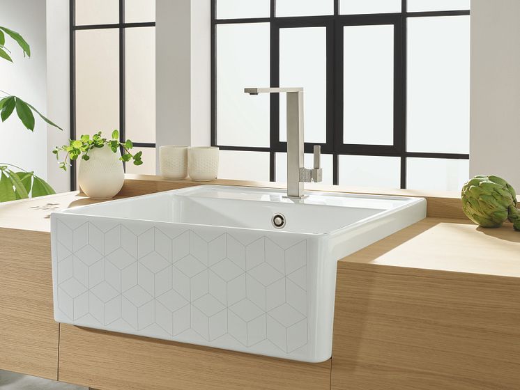 Das charakteristische Dekor Jubilee kann mit einer passenden Keramikspüle weiter vertieft werden. Die geometrischen Rhomben wurden mit zarten, grauen Linien auf den beliebten Spülstein aufgebracht. Durch den Einsinkeffekt der Glasur entsteht eine ausgeprägte Haptik. Zusammen bilden die Armatur Finera Square Jubilee und der Spülstein Mosaïque ein umwerfendes Ensemble, das alle Blicke auf sich zieht.