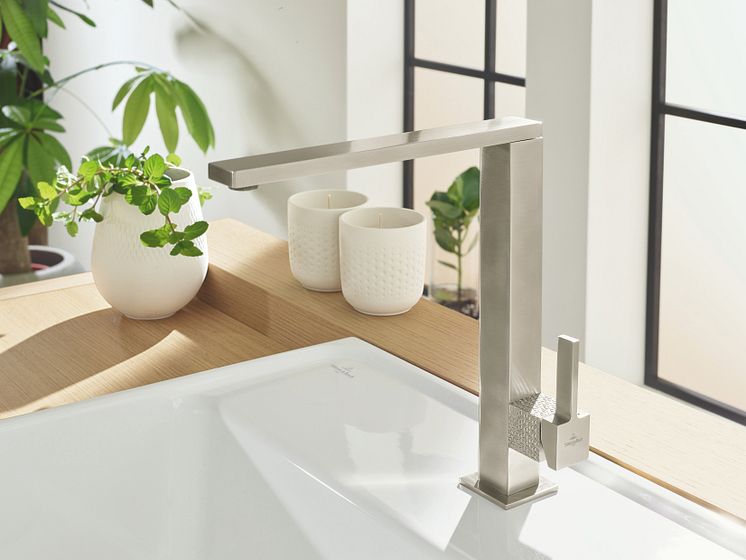 Die exklusive Designarmatur Finera Square Jubilee vereint selbstbewusst eine moderne, klare Formensprache mit einer Dekoration aus der Mitte des 19. Jahrhunderts. Dazu wurde auf dem markanten Kartuschensitz das Muster der historischen Fliesenverlegung übersetzt. Das dreidimensional anmutende Mosaik aus kleinen Rhomben wurde in feinen Linien in den hochwertigen Edelstahl graviert.
