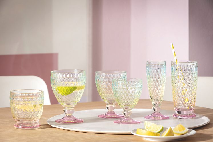 Auch die klassische Glasserie Boston, deren vollflächige Rautenschliff-Optik funkelnde Farbakzente setzt, ist in der neuen Trendfarbe Pearl erhältlich, die mit ihrem irisierenden Effekt das hochwertige Kristallglas zum besonderen Blickfang macht: Das Facettenmuster, in dem sich das Licht gleich mehrfach bricht, lässt in Pearl jedes Glas geradezu magisch erstrahlen.